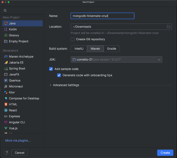 If you prefer, you can create it manually using the command line—the structure and configuration will be exactly the same. We’ll use Maven for dependency management in this example, but the same setup applies if you prefer Gradle.