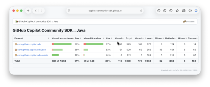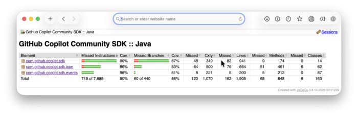 You can see the live result on our documentation site: Copilot SDK for Java — JaCoCo Report.
