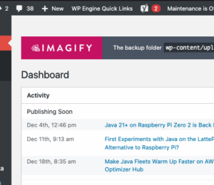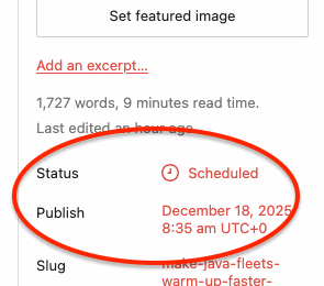 - Schedule yourself: Check the homepage of Foojay.io for the list of scheduled posts. You can also find this info, when logged in, on the WordPress Dashboard. Find a date without scheduled posts, and use this to schedule your post yourself. Go to the Foojay community on Slack > #foojay-site-content channel, and say "I scheduled <your article> to be published on <date>."