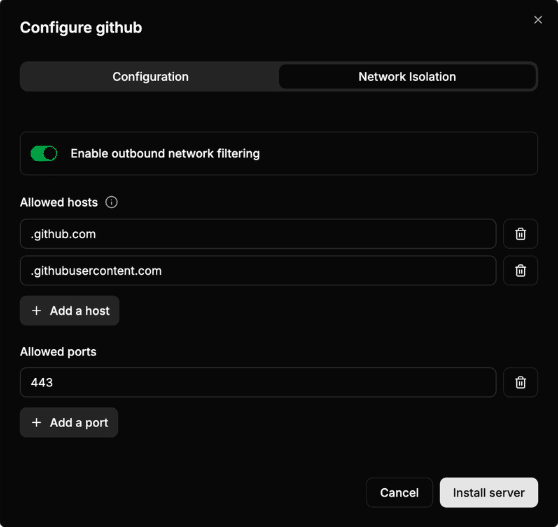 - Use tools like ToolHive: they add proxies and egress containers routing the network and allowing us to configure the allowed network destinations for each container (MCP server)
