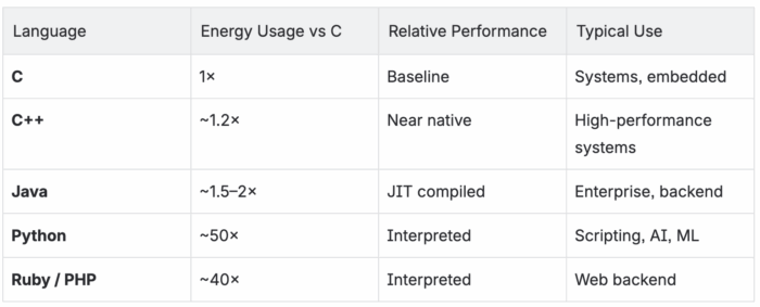 That’s not a typo — for the exact same algorithm, Python can consume 50× more energy than C. Java sits somewhere in between — but that’s only when we write efficient code. Badly written Java can easily behave like a scripting language on a caffeine overdose.