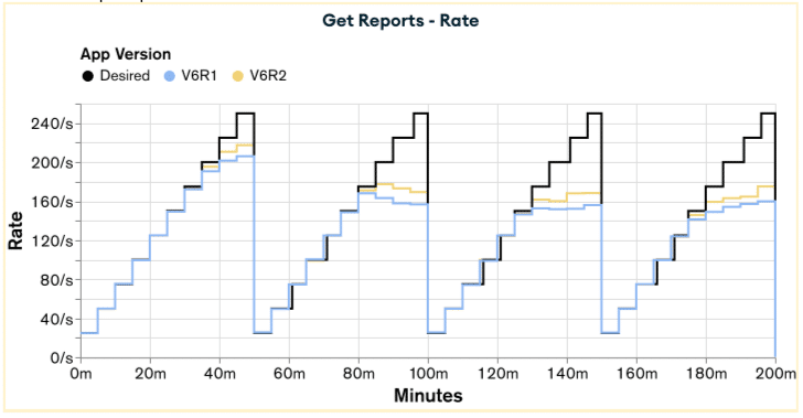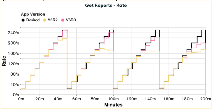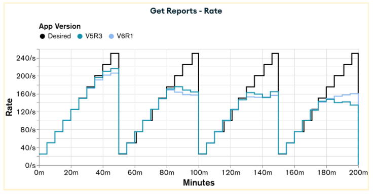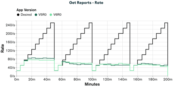 Executing the load test for appV6R0 and plotting it alongside the results for appV5R0 and Desired rates, we have the following results for Get Reports and Bulk Upsert.