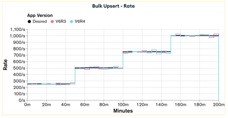 Executing the load test for appV6R4 and plotting it alongside the results for appV6R3, we have the following results for Get Reports and Bulk Upsert.