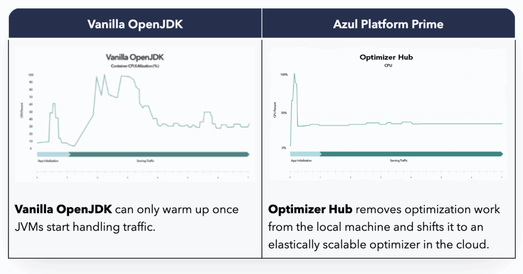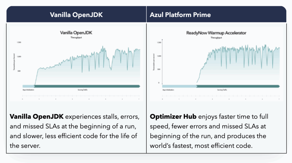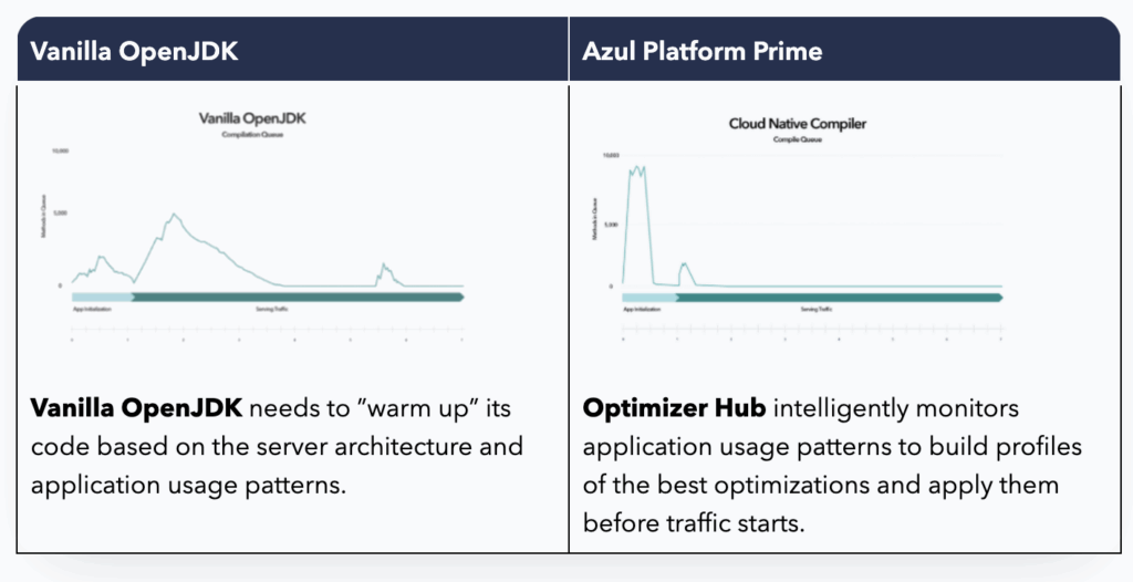 The drawback to runtime profiling and JIT compilation in traditional JVMs, like vanilla distributions of OpenJDK, is that it leads to a delay in when the application can deliver its peak performance. Frequently used code must be identified, how that code is being used must be profiled, and it must be compiled while the application is running. The time this takes is what is referred to as the warm-up time for a Java application.
