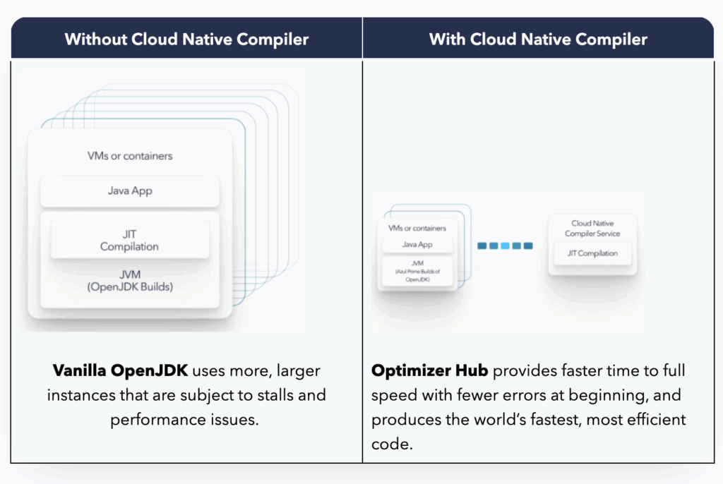 - Cloud Native Compiler provides centralized JIT compilation and caching to deliver cost savings and efficiency. Cloud Native Compiler shifts the heavy work of compilation from individual JVMs to a centralized, scalable service, slashing CPU workload on each JVM and caching compilation for reuse.
